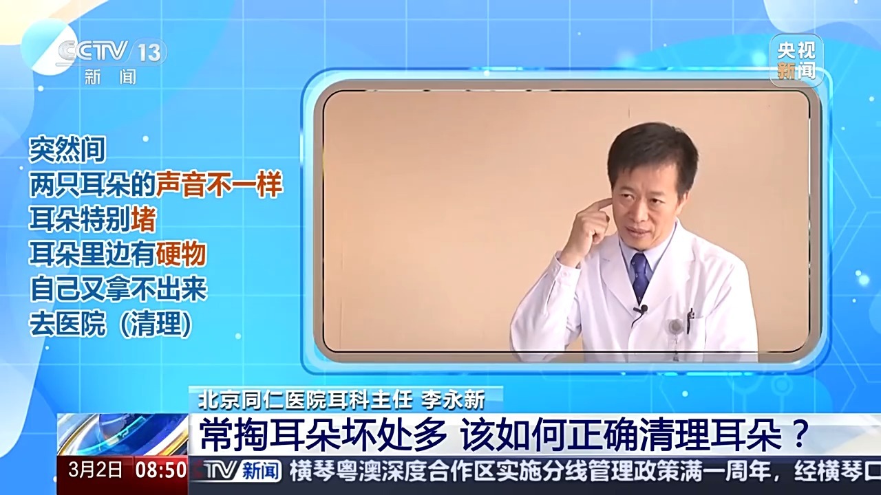 北京同仁医院耳科主任 李永新:每个人的耳道口都有一圈耵聍在附着着,那是耵聍腺分泌的一种物质。这个物质它有保护作用。同时耵聍还有杀菌的作用,我们上耳道的皮肤都有纹理血管,那么你经常掏会导致皮肤血管的增生,让通透性下降,容易患病。当然你掏的物件如果不干净,还可以人为种植细菌,甚至真菌长在你的耳道里,所以清理相应有一个度,过度肯定不对。